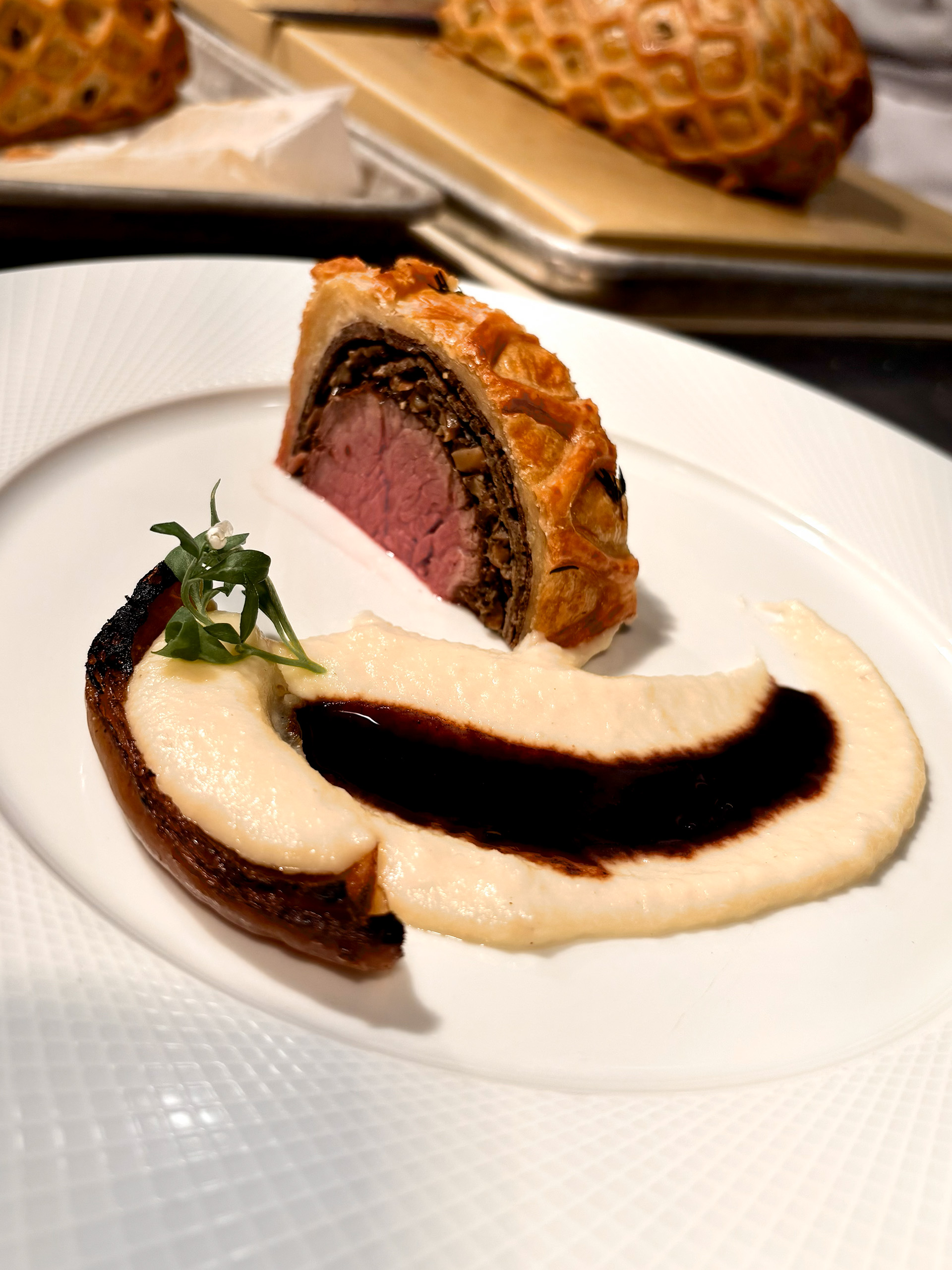 Beef Wellington accompanied by black garlic bordelaise, charred onions, and pommes purée.